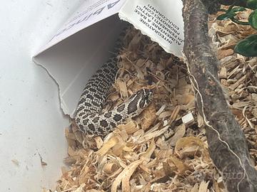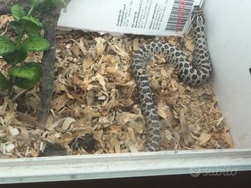 Vendo come da titolo serpente Heterodon nasicus maschio , chiamato in Italia muso porcello, è un baby che mangia pinky congelati regolarmente ogni settimana, viene ceduto con la relativa teca o senza, ovviamente la suddetta teca è temporanea e non è adatta a un esemplare adulto. Facile gestazione, carattere ampiamente tranquillo e adatto a neofiti. Non si spedisce, solo consegna a mano zona Milano e limitrofe. Il prezzo è riferito compreso di teca , leggermente trattabile.
