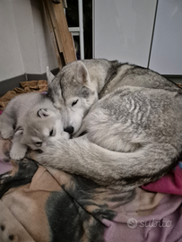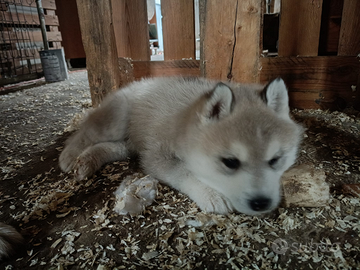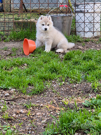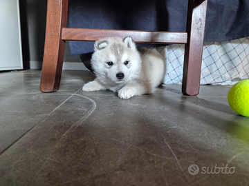 Disponibile cucciolo maschio di siberian husky bianco/grigio occhi scuri. Il cucciolo nato a inizio novembre, verrà ceduto dopo i 60giorni di vita( primi giorni di gennaio) con iscrizione all'anagrafe canina, microchip, ciclo di sverminazione completo, primo vaccino, pedigree enci e puppy kit. Cucciolo nato e cresciuto in casa, genitori testati ed esenti da displasia dell'anca e oculopatie.