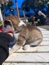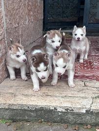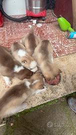 Cuccioli di siberian husky nati il 16 dicembre da un parto naturale, disponibili sia maschi che femmine sono 3 chiari (champagne) e 1 scuro (cooper), occhi celesti con 50% di possibilità di eterocromia saranno disponibili da febbraio (compiuti i 60gg). genitori di mia proprietà.