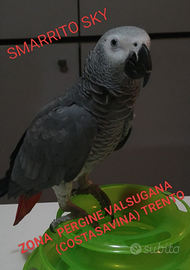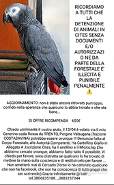 Chiedo umilmente il vostro aiuto, il 13/04 è volato via Il mio Cenerino coda Rossa da TRENTO, Pergine Valsugana (frazione COSTASAVINA) potrebbe essere ovunque, se qualcuno dovesse avvistarlo vi prego! di contattarmi per cercare di recuperarlo,non è diffidente potrebbe essere confuso o spaventato.Denuncia fatta al Corpo Forestale,Ha l'anello FOI,Cites e il microchip !