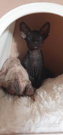 Bellissimo gattino Sphynx nero, dal fascino elegante e particolare. Manto con effetto vellutato Carattere dolcissimo, affettuoso e molto socievole, ama il contatto umano ed è sempre in cerca di coccole. Sverminato No pedigree Abituato alla convivenza con altri animali Ideale anche per famiglie Gattino vivace, curioso e molto legato alle persone Si può vedere dal vivo vicino ai genitori