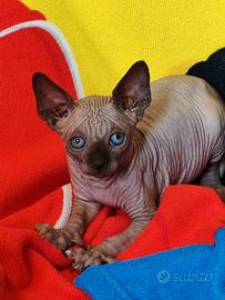 Disponibile indicativamente dal 5 di maggio al compimento dei 2 mesi cucciolo maschio di canadina sphynx colore chocolate mink occhi acqua marina. Il cucciolo verrà ceduto con libretto sanitatio, doppia sverminazione e primo vaccino. Genitori entrambi visibili con pedigree esenti fiv felv hcm. se interessati contattatemi