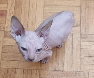 Vendo gattino di 3 mesi razza Sphynx. Colore bianco, occhi azzurri/ghiaccio. Sverminato, NO Pedigree, non ha ancora documento e vaccini in attesa di accordarsi col nuovo proprietario. Nato dai nostri due gatti, la mamma è una Sphynx grigia, occhi verdi e il papà è uno Sphynx Point Black con occhi azzurri/ghiaccio.
