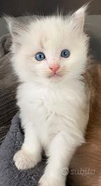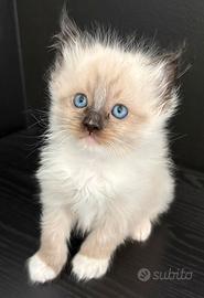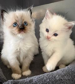 Disponibili alla prenotazione 4 meravigliose femminucce di razza Ragdoll da compagnia nate il 19 febbraio, pronte per raggiungere la loro nuova famiglia a partire da metà maggio. Le cucciole sono di diverse colorazioni, cresciute in ambiente familiare, abituate al contatto umano e seguite con amore e attenzione fin dai primi giorni di vita. Saranno cedute con libretto sanitario Ciclo completo di vaccinazioni Ciclo di sverminazioni Microchip Pedigree Kit di benvenuto Regolare contratto di cessione Caratterialmente sono dolcissime, affettuose e coccolone, tipiche della razza Ragdoll: ideali per famiglie con bambini o per chi desidera un compagno a quattro zampe affettuoso, dal carattere equilibrato e tranquillo, perfetto anche per pet therapy. I genitori sono testati per le principali malattie genetiche. "Visite disponibili su appuntamento. Contattateci per maggiori informazioni." Allevamento amatoriale con affisso riconosciuto WCF/AGI