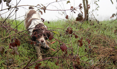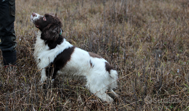 Maschio di 20 mesi addestrato per la cerca, sempre collegato a 20 metri dal cacciatore.