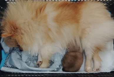 Disponibile alla prenotazione un bellissimo di mini cucciolo di volpino di pomerania femmina, genitori visibili nelle foto con prestigioso pedigree entrambi, papà 2,2kg mamma 1,8kg,la cucciola attualmente a 10 giorni verrà consegnata all' età di mesi 2/3 comunque allo svezzamento completo, verrà consegnata senza pedigree comunque una cucciola di grande prestigio lo stesso.