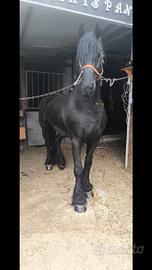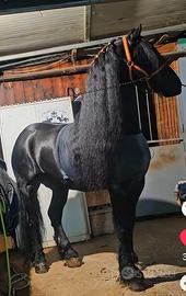 Vendo stallone frisone 9 anni addestrato in alta scuola spagnola Esegue piaffer ,passage e passo spagnolo ottimo lavoro in piano sano di tutto criniera e cosa lunghissima alto 165 cm al garrese cavallo equilibrato...