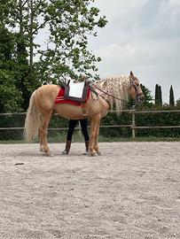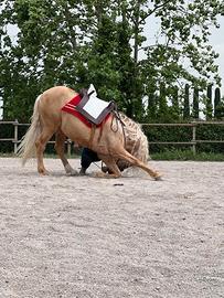 Stallone Lusitano palomino, 12 anni, circa 160cm, addestrato in alta scuola montato e da terra (da riprendere in mano), bravo montato in campo e in passeggiata, nessuna paura.