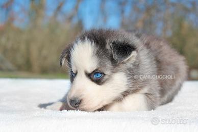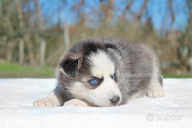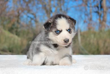 Cucciola di Siberian Husky disponibile. Piccola meraviglia dall'aspetto lupino. Si chiama indicativamente Penny. Femminuccia di 2 mesi di età. Cucciola vivace, giocherellona e socievole con tutti. Non potete non innamorarvi dei suoi splendidi occhi azzurro-ghiaccio.