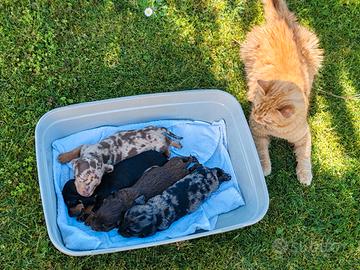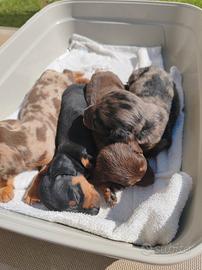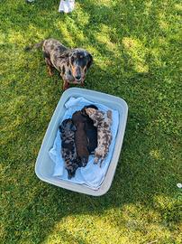 Veramente bella cucciolata di bassotti tedeschi nani a pelo raso nati il 1 marzo disponibili dai primi di maggio e sono composti da 2 maschi arlecchini (1 silver e 1 choco ) e 2 femmine (1 nero focata e 1 cioccolato).No pedigree . Genitori visibili (anche nelle foto ): papà nero focato e mamma arlecchino silver entrambi con gene cioccolato . Saranno consegnati con libretto sanitario certificante il primo vaccino tetravalente e 3 sverminazioni .DA VEDERE !! Vi chiedo di contattarmi via WhatsApp al numero 3477309581 . NO Perditempo Da 650 euro
