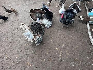 Cedo due galli fratelli nati questa primavera incrocio padovani con galline nostrane , uno con cresta a farfalla come in foto 15€ caduno E tre tacchini maschi fratelli leggeri nostrani nati in primavera colorazioni diverse 30€ caduno