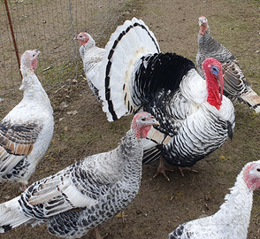 Il tacchino maschio è un po più pesante circa 7.5kg mentre la femmina dai 4 ai 5.5kg. Color bianco e nero ermellinato.