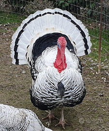 Sono esemplari di tacchino nostrano color ermellinato di Rovigo bianchi e neri nati ad inizio 2025, disponibili sia maschi che femmine.
