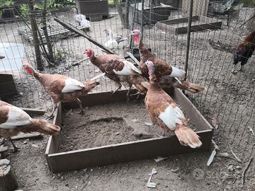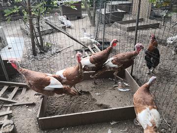 Cedo tacchini rossi 3 maschi e 1 femmina. Animale di circa 5 mesi praticamente finiti ma andrebbero ingrassati un pochino. Taglia leggera nostrana. Non spedisco. Solo ritiro a mano e in zona dalle mie parti. Prezzo 70€ x I maschi e 50€ x la femmina.