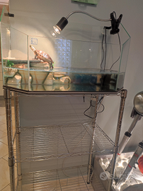 Taratura d'acqua di circa 2 anni, lunga circa 15 cm. Completa di acquario grande con isolotto, pompa filtro, luce riscaldante e scaffale supporto.