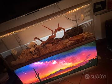 Arredo interno compreso: tronco + tana in ceramica + teschi in plastica + pietre + ciotola in pietra + tappetino riscaldante + termostato automatico esterno con sensore interno + led perimetrale RGB azionabile con telecomando.