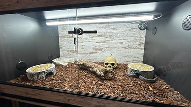 Sono compresi tutti gli accessori necessari per il benessere dell'animale: tappetino riscaldato che copre metà della teca, barra led per illuminazione diurna, termostato con sonda per la regolazione della temperatura del tappetino più controllo delle ore di luce interna della barra led, igrometro per il controllo dell'umidità interna, ciotola dell'acqua, tane ecc..)