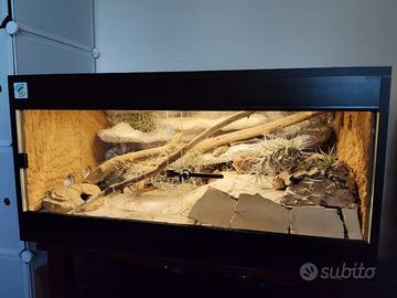 Vendo terrario con arredamento fatto a mano in stile desertico/giungla, completo di termostato trixie professionale e luce led, tutto già impostato(temperatura e orario). Comprese anche piante, tane e accessori. Cedo anche le 2 femmine di geco leopardino all'interno, convivono da 3 anni, per specifiche sul morph scrivetemi in privato. Misure Terrario: Lunghezza: 90cm Altezza: 45cm Profondità: 50cm Contattatemi se veramente interessati, grazie.