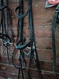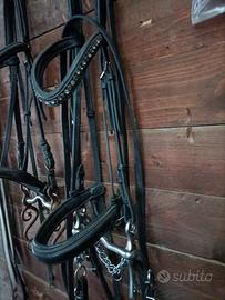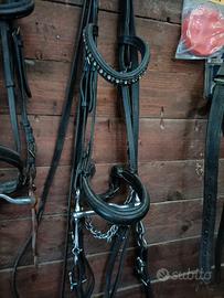 Vendo testiera con brillantini svaroski e morso spagnolo con redini tutto in cuoio nero possibile spedizione..