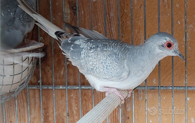 Vendo questa tortora diamantina femmina del 2025 pronta per la riproduzione genitori pezzati a soli euro 15 Tel.339 355 9827 Albino posso valutare per eventuale consegna.