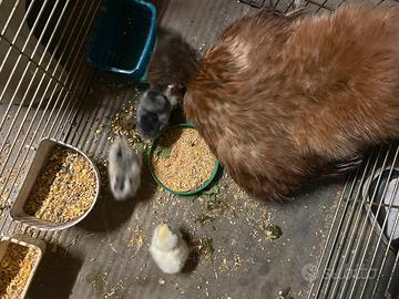 Cedo tre pulcini incrociati con Moroseta , madre chioccia Moroseta pura mogano, padre millefiori, 10€ solo x i pulcini la chioccia nn è in vendita