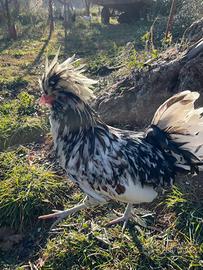 Vendo trio galline razza Padovana composta come in foto da un gallo tricolore di 2 anni e 2 galline ottima linea di sangue di 2 e 3 anni in buona salute