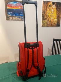 Zaino-trolley in tela rosso con tasche laterali, doppia apertura frontale, gancio interno di sicurezza Altezza cm 55 larghezza cm 35 profondità cm 20 Mai usato