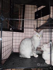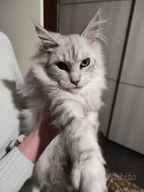 Disponibile ultima cucciola di Maine Coon Silver shaded line Xxl . Genitori visibili di proprietà,la cucciola verrà ceduta con libretto sanitario completo di doppia sverminazione e vaccini , pedigree da compagnia, abituata a lettiera e tiragraffi, a cani, simili .. vive in famiglia, molto dolce e affettuoso, ottimo carattere socievole e coccolone. Genitori testati geniticamente di proprietà esenti fiv felv hcm pkd ecocardio nella norma, esami feci periodico negativo per germi batteri e giardia. Disponibile subito, 4 mesi. Non in regalo . Possibilità di consegna personalmente.