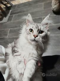 Disponibile ultima cucciola di Maine Coon Silver shaded line . Genitori visibili di proprietà.La cucciola verrà ceduta con libretto sanitario completo di doppia sverminazione e vaccini , pedigree da compagnia, abituata a lettiera e tiragraffi, a cani, simili .. vive in famiglia, molto dolce e affettuosa, ottimo carattere socievole e coccolona. Genitori testati geniticamente di proprietà esenti fiv felv hcm pkd ecocardio nella norma, esami feci periodico negativo per germi batteri e giardia. Disponibile subito, 4 mesi. Non in regalo . Possibilità di consegna personalmente