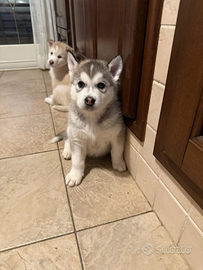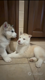 Bellissimi cuccioli di Husky siberiano disponibili, sono un maschietto e una femminuccia, teneri e affettuosi, sono nati il 21 ottobre, sono particolari in quanto hanno gli occhi di coloro diverso.