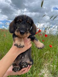 Cediamo ultimo meraviglioso cucciolo color cinghiale di bassotto tedesco a pelo duro nato da madre (standard) e padre (kanknkhen) entrambi con pedigree ENCI e visibili, nato il 19.03.25.
