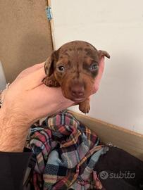 Disponibile ultimo Maschio bassotto Arlecchino cioccolato. Nata il 13 di marzo cedibile dal 13 di maggio. Genitori visibili. I cuccioli e i genitori non hanno il pedigree Il cucciolo è ceduto legalmente con microchip, Per into contattare su WhatsApp 3801889328 Ci troviamo a lanciano ch Abruzzo