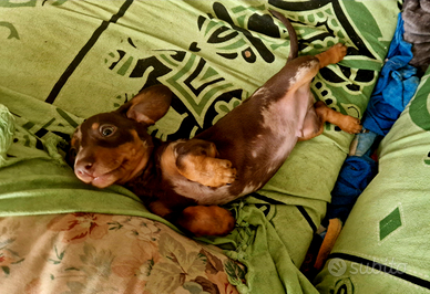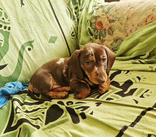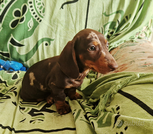 Di una cucciolata di 7 cuccioli è rimasto l'ultimo maschio di bassotto, lui è di colore arlecchino cioccolato, la mamma è color cioccolato taglia standard e il papà è arlecchino cioccolato taglia nana campione di bellezza.