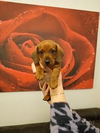 Bellissimo cucciolo di bassotto , nato il 14 febbraio , pronto dal 15 aprile , viene ceduti con microchip , primo vaccino , sverminato , nati in ambiente famigliare abituati ai bambini e a socializzare con altri cani , genitori visibili , non hanno problemi alimentari , abituati a mangiare sia secco che umido , cibo preparato da noi , carne macinato riso verdure . Ultimo maschio marrone . Non hanno il pedigree , i genitori sono di due linee di sangue lontane nessuna parentela , i nonni non hanno avuto problemi di ernia . Contattate per qualsiasi info aggiuntiva , non faccio viaggiare i cani in staffetta . Genitori con carattere dolce e affettuoso , pronti a socializzare e a conoscere , ottimi compagni di viaggio , passeggiate , esploratori nati , carattere ubbidiente , abituati a essere chiamati e rispondere al comando di richiamo .