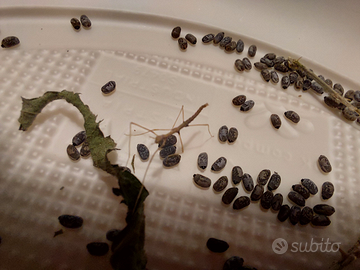 Vendo uova e neanidi di insetti stecco. Schiusa entro massimo 6 settimane. L'insetto stecco alla nascita (neanide) misura poco più di 1 cm mentre da adulto può raggiungere i 10 -12 cm (vedi foto). 5 euro per 20 uova oppure 10 neanidi e 10 uova