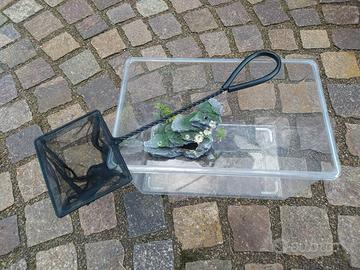 Vaschetta in plastica per pesci, dimensioni 30 x 20 x h20 cm. Coperchio rimovibile con apertura per versare il cibo. Con retino e finto sasso. Usato pochissimo.