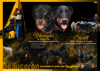 Il 18 ottobre sono nati 8 cuccioli di beauceron 2 femmine e 6 maschi. I cuccioli saranno disponibili dopo il compimento dei 2 mesi e verranno ceduti con pedigree, vaccinazioni e sverminazioni. I genitori sono esenti displasia, testati per malattie genetiche, DNA depositato, hanno prove di lavoro e morfologia. I cuccioli, cresciuti in famiglia, vengono seguiti scrupolosamente dalla nascita, vengono stimolati e socializzati in modo da diventare adulti equilibrati. Per maggiori informazioni scrivetemi o telefonatemi.