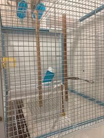 Voliera come nuova . Misure 143 cmx 53 cm . Divisibile in 2 . Accessori : 4 mangiatoie , 5 beverini , 4 bastoni lunghi , altalena .