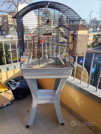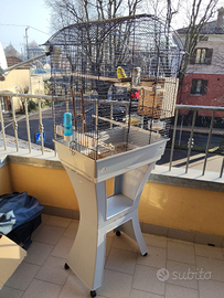 Vendo voliera molto bella e versatile,comoda e mobile per via delle ruote colore blu/celeste,incluso un ripiano utile nella parte inferiore.