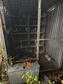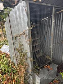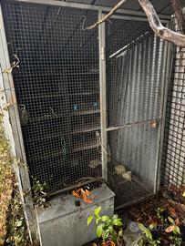 Voliera professionale per 8 coppie di colombi, con mangiatoia, si cede insieme alla lamiera che la copre sui lati, facile da pulire.