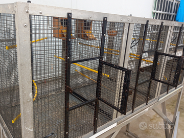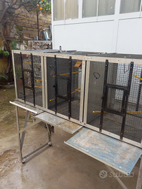 Voliera interamente fatta a mano. Si può dividere in tre in due o in un unica gabbia con separatori sia in rete che in alluminio con raccoglitori per gli escrementi sempre in alluminio con ganci per appendere al muro o sul carrellino sempre in alluminio con ruote come in foto. Lunga 1,46 cm profonda 0.53 cm alta 0.58 cm.. prezzo trattabile
