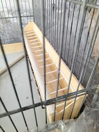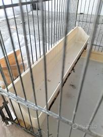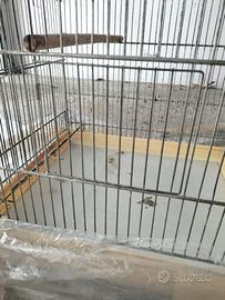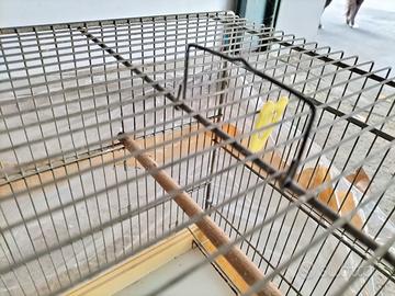 Inclusi: 2 mangiatoie (una con grata superiore rotta ma funzionante), 4 trespoli (3 in legno + 1 in plastica), possibili beverini