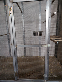 Voliera autocostruita con ruote e vassoio per la pulizia del fondo. Misure cm 250x120x altezza 250. Porta x accesso cm 60x140. NON È SMONTABILE. Solo ritiro diretto no perditempo!