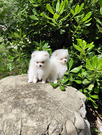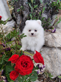 Spitz tedesco nano total white, età 6 mesi, quindi in piena muta, molto piccolo. Ciclo vaccinale e sverminazione completa, microchip, pedigree Enci. Recupero spese