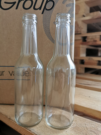 Bottiglie di vetro da 250 ml per acqua, succhi o bevande. Tappi a vite 28x15 Guala. Totale 47.000 bottigliette + 47.000 tappi. Adatto per pastorizzazione. Prezzo comprensivo di bancali e interfalde. Prezzo bottiglia: 0.15€ Prezzo tappo: 0.02€