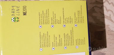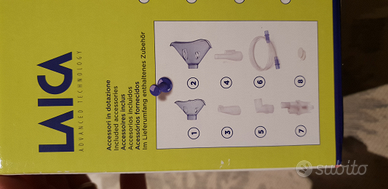 Accessori in dotazione: maschera adulti, maschera pediatrica, boccaglio, nasale, raccordo per maschere, ampolle porta medicinale