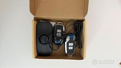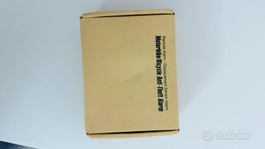 Sistema di allarme antifurto per bicicletta, completo di due telecomandi per l'attivazione e la disattivazione. Include anche un cavo di ricarica. - Unità principale dell'allarme. - Due telecomandi. - Cavo di ricarica.