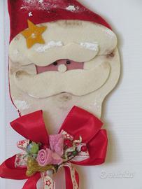 Faccione di Babbo Natale da appendere alle maniglie di porte e finestre abbellito da nastrini, fiori, bacche e campanellina.