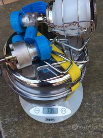 Attrezzature bivacco/montagna, set completo pentolini in acciaio, fornello e lampada, posate e bicchieri. Ultraleggero ( 1,5 c.ca)