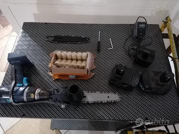 Avvitatore con minisega a catena, con 2 batterie, celle di ricambio per una batteria, catena e barra di ricambio,alimentatore per ricaricare. Nota: le batterie vanno ricaricate prima di usarle, perchè funzionano per il lavoro, ma non restano cariche per giorni, neanche in caso di inutilizzo.